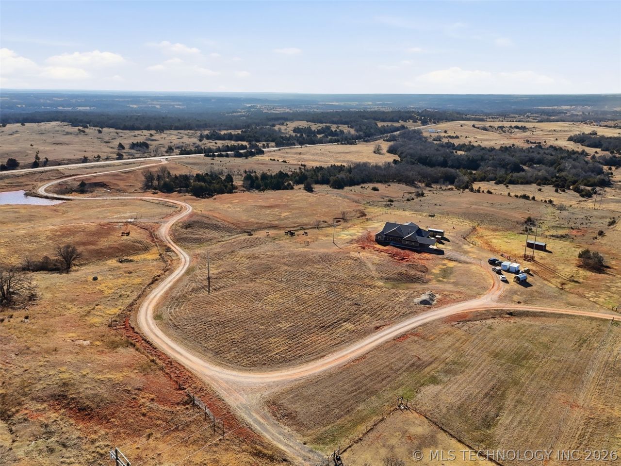 Custom-built in 2020, this 2,828 square foot home offers 5 bedrooms, 3 baths, and sits on just over 13 private acres just about 10 minutes from I-35. Designed for both comfort and functionality, the home features stained concrete floors, professional-series kitchen appliances, a large walk-in pantry, and a coffee bar with beverage fridge. Spacious laundry room with sink. Two fireplaces - one in the living room and one in the primary bath beside the soaking tub - add warmth and character. Unique layout includes two primary suites. For added peace of mind, the home also includes a walk-in tornado shelter. Enjoy beautiful southern views from the large covered back porch. Ideal for privacy, horses, or cattle.