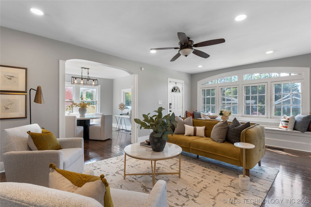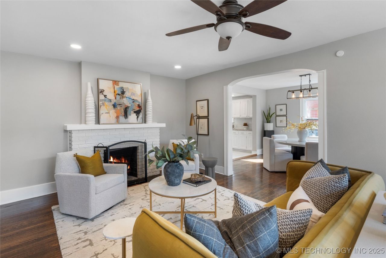 Step into this beautifully updated bungalow in the heart of Tulsa's historic Owen Park neighborhood. This charming one-story home offers 3 spacious bedrooms, 2 full bathrooms, and a large living area with a decorative fireplace and window seat that adds a cozy touch. The expansive remodeled kitchen flows seamlessly into the light-filled dining room, perfect for entertaining. The primary bedroom features its own private bath for added comfort. The large 3rd bedroom with decorative fireplace also makes a terrific office. Recent updates include refinished original hardwood floors, a newer roof, tile flooring, updated wiring, electric panel, HVAC, windows, and more! Outside, you'll find a large, fenced yard with alley access and a handy storage building. This home combines modern conveniences with vintage charm-ready for you to move in and make it your own.